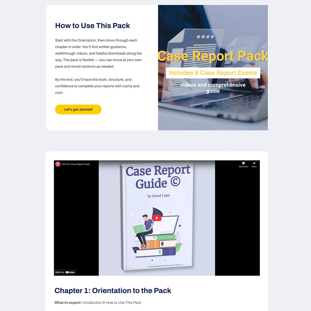 ✅ Comprehensive Guide: A step-by-step guide to understanding and structuring your case reports correctly, with clear explanations of each section. ✅ Eight Example Case Reports: See case report examples to understand the structure, tone, and depth needed for a strong submission. ✅ Loads of FAQs: Get answers to common case report questions, so you don’t waste time second-guessing the process. ✅10 Key Tips for Writing Case Reports: Expert insights on what assessors look for, how to refine your writing, and common mistakes to avoid. ✅ Video Walkthroughs: Guided videos explaining each section of the case report, making it easier to follow along and apply the concepts.